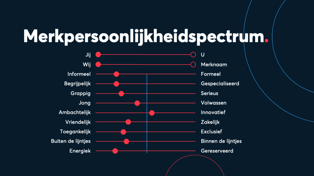 In het merkpersoonlijkheidspectrum kun je grofweg ‘vastleggen’ hoe een merk klinkt. Modern of klassiek? Leuk of serieus? Daar kun je keuzes in maken, die gevoelsmatig het beste bij ons passen. Waarschijnlijk zou iedereen dit model net wat anders invullen. Sommigen zouden misschien juist aan de rechterkant kruisjes zetten. Maar voor Juist past de linkerkant van dit model het beste.